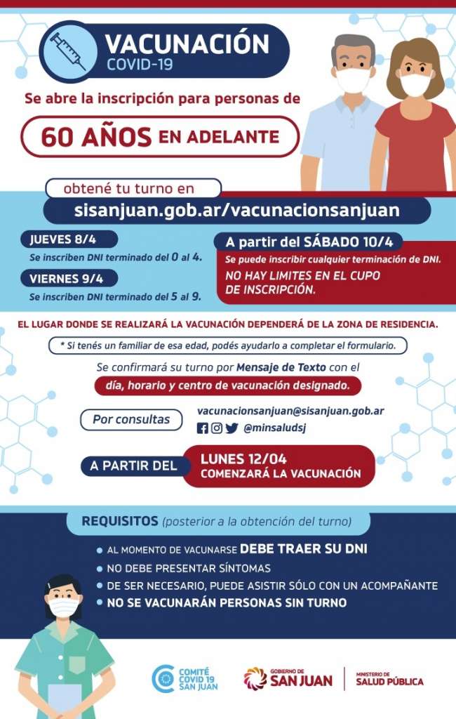 A partir del Jueves, 8 de Abril, comienza la inscripción a la población mayor de 60 años contra el COVID-19. Así lo confirmó la ministro de Salud Pública del Gobierno de San Juan, Dra. Alejandra Venerando.
